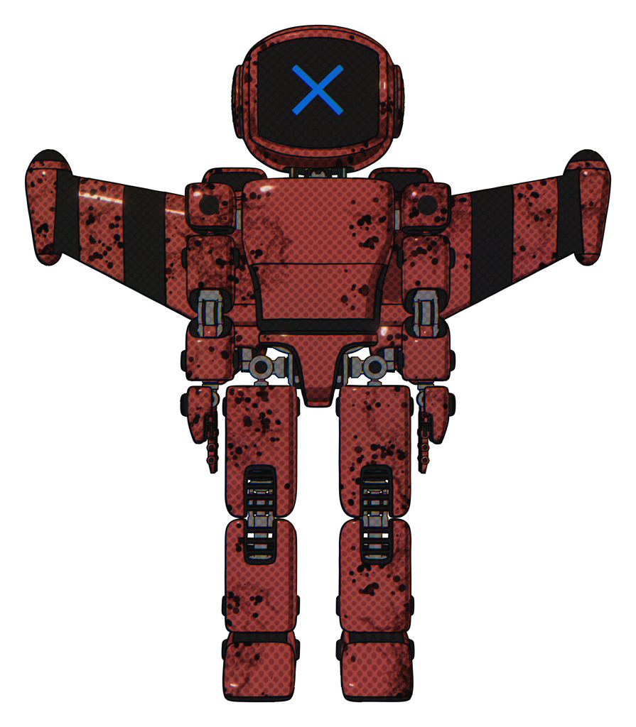 Bot containing digital display head and x face and light chest exoshielding and prototype exoplate chest and stellar jet wing rocket pack and prototype exoplate legs. Grunge matted orange. Front view.