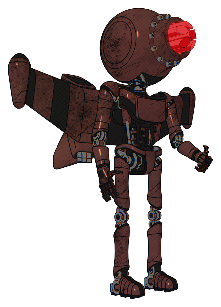 Droid containing round head and red laser crystal array and light chest exoshielding and ultralight chest exosuit and stellar jet wing rocket pack and ultralight foot exosuit. Steampunk copper.