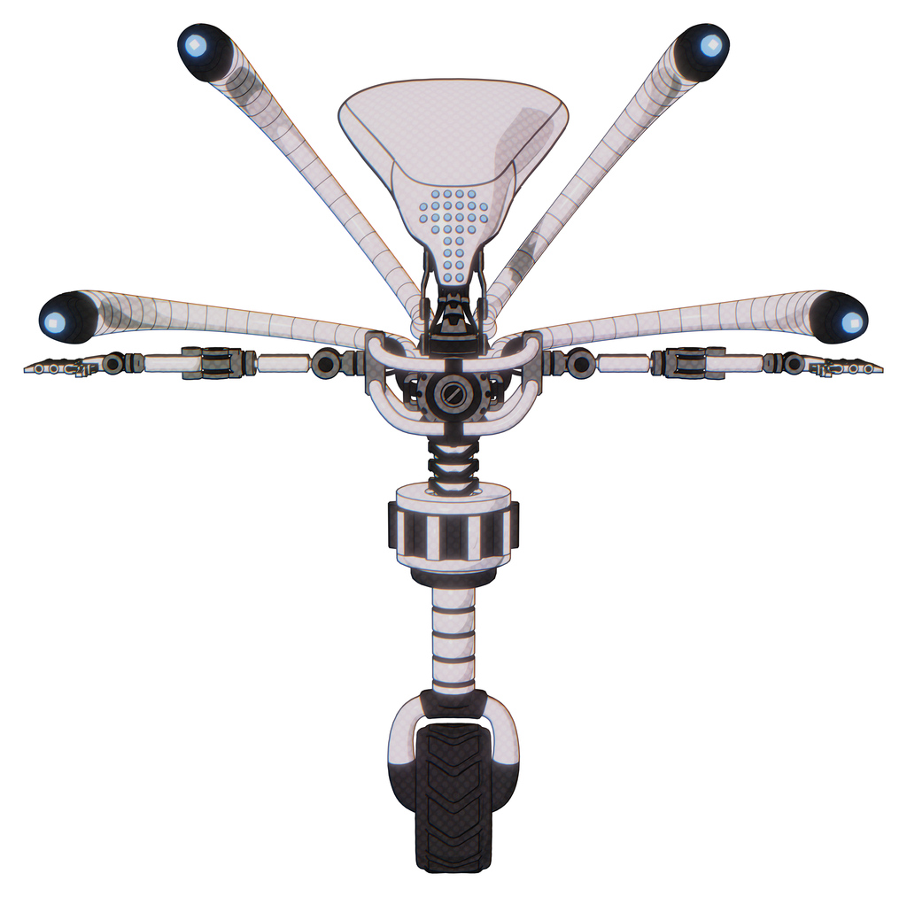 Automaton containing flat elongated skull head and light chest exoshielding and blue-eye cam cable tentacles and no chest plating and unicycle wheel. White halftone toon. T-pose.