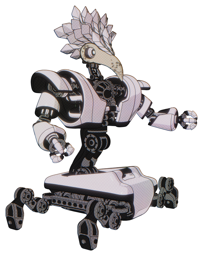 Mech containing bird skull head and white eyeballs and bird feather design and heavy upper chest and heavy mech chest and insect walker legs. White halftone toon. Interacting.