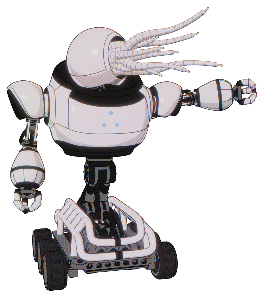 Bot containing jellyfish style head fiber optic tentacles and heavy upper chest and triangle of blue leds and six-wheeler base. White halftone toon. Pointing left or pushing a button..