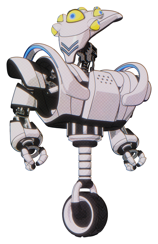 Mech containing flat elongated skull head and yellow eyeball array and heavy upper chest and heavy mech chest and battle mech chest and unicycle wheel. White halftone toon. Hero pose.