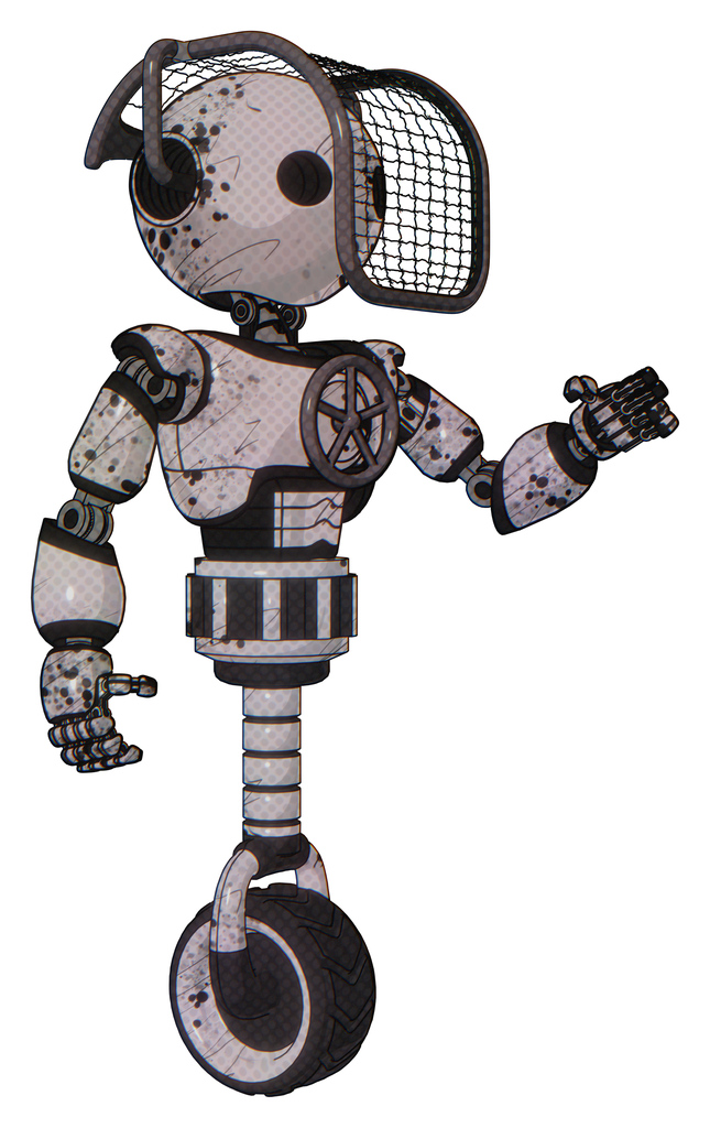 Bot containing oval wide head and barbed wire visor helmet and light chest exoshielding and chest valve crank and unicycle wheel. Grunge sketch dots. Interacting.