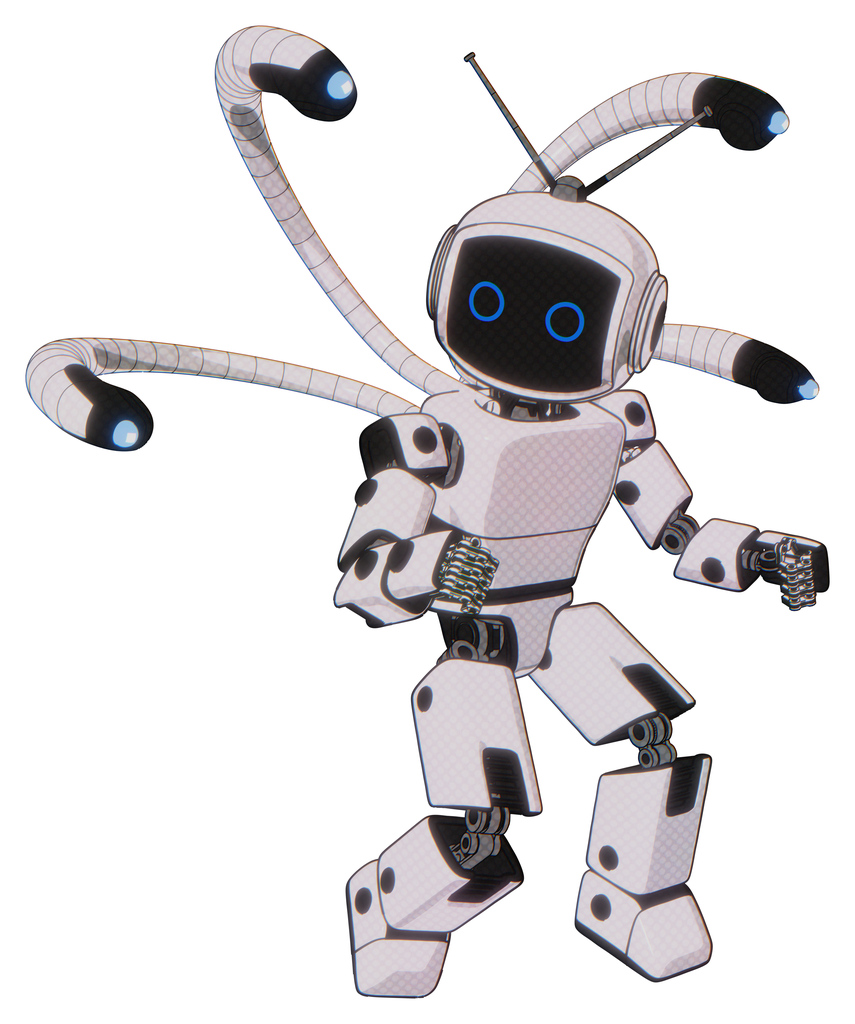 Automaton containing digital display head and circle eyes and retro antennas and light chest exoshielding and prototype exoplate chest and blue-eye cam cable tentacles and prototype exoplate legs.
