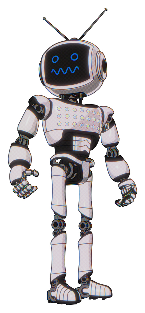 Automaton containing digital display head and stunned expression and retro antennas and light chest exoshielding and chest green blue lights array and ultralight foot exosuit. White halftone toon.