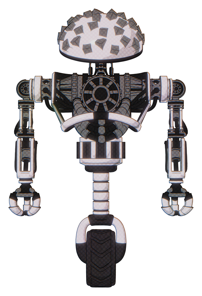 Automaton containing metal cubes dome head design and heavy upper chest and no chest plating and unicycle wheel. White halftone toon. Front view.