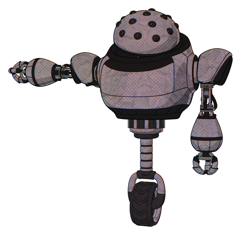 Bot containing black sphere cam design and heavy upper chest and unicycle wheel. Dark sketch. Arm out holding invisible object..