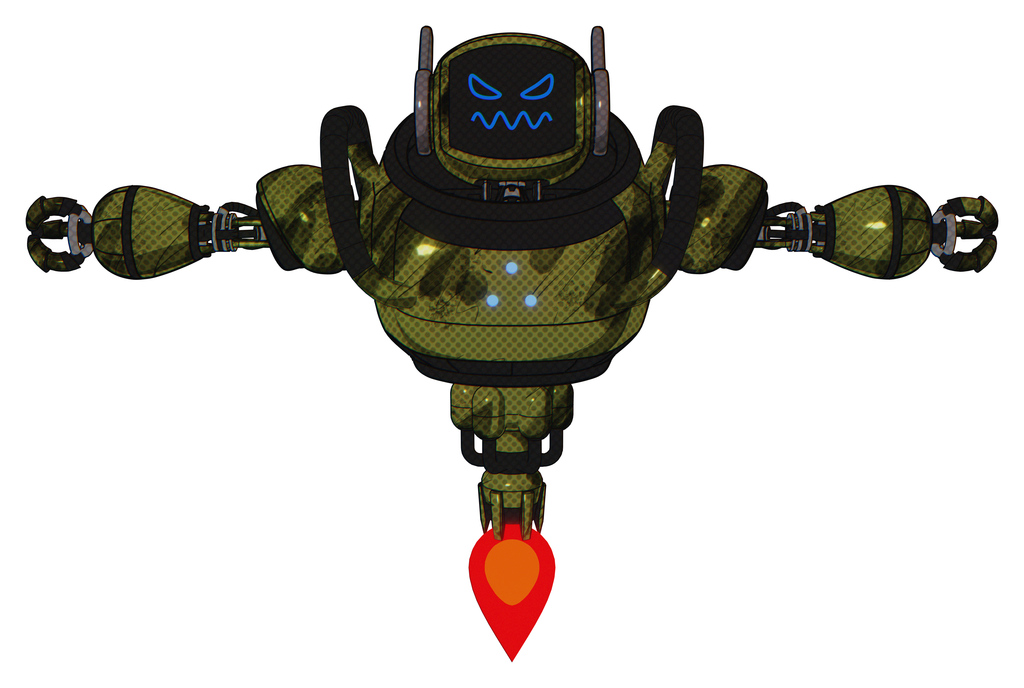 Bot containing digital display head and angry face and winglets and heavy upper chest and triangle of blue leds and jet propulsion. Grunge army green. T-pose.
