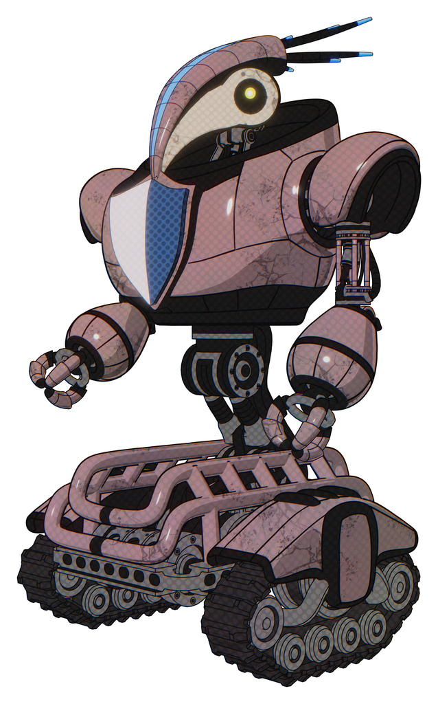 Mech containing bird skull head and yellow led protruding eyes and head shield design and heavy upper chest and blue shield defense design and tank tracks. Grayish pink. Facing right view.