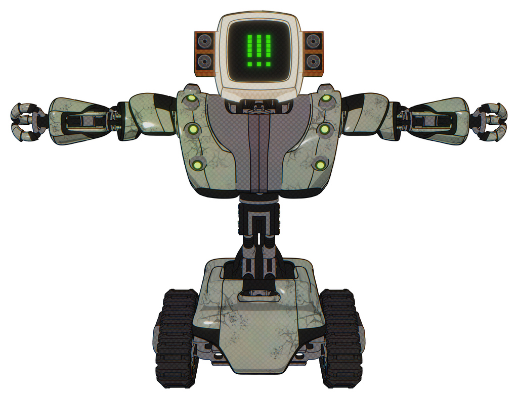 Bot containing old computer monitor and pixel exclamation point alert face and old retro speakers and heavy upper chest and heavy mech chest and green cable sockets array and tank tracks. Green metal.