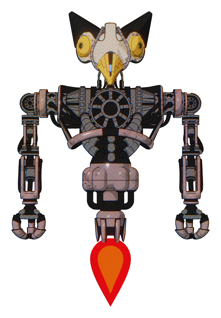 Robot containing bird skull head and brass steampunk eyes and robobeak design and heavy upper chest and no chest plating and jet propulsion. Powder pink metal. Front view.