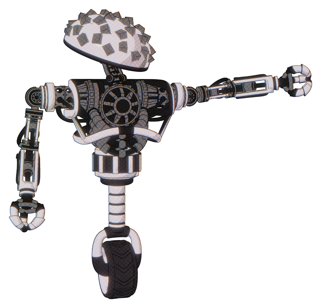 Automaton containing metal cubes dome head design and heavy upper chest and no chest plating and unicycle wheel. White halftone toon. Pointing left or pushing a button..