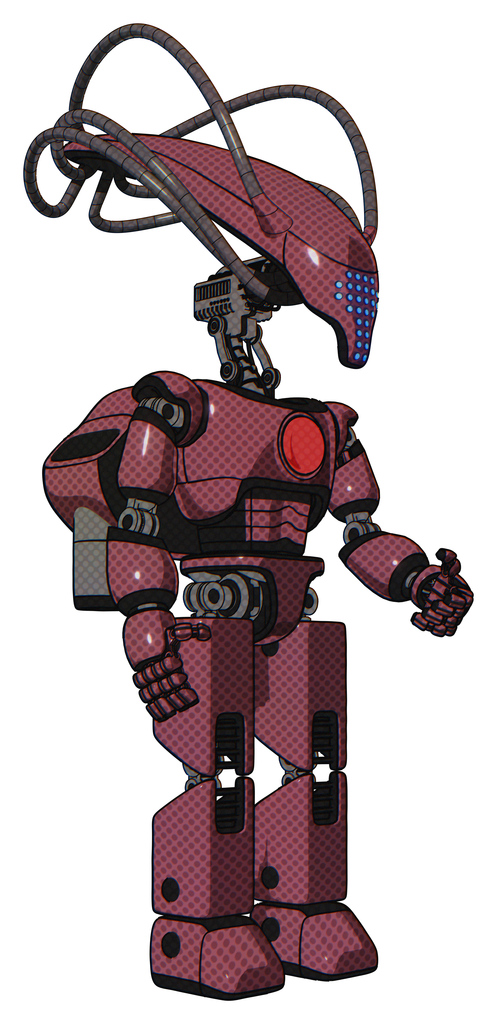 Droid containing flat elongated skull head and cables and light chest exoshielding and red chest button and rocket pack and prototype exoplate legs. Muavewood halftone. Facing left view.