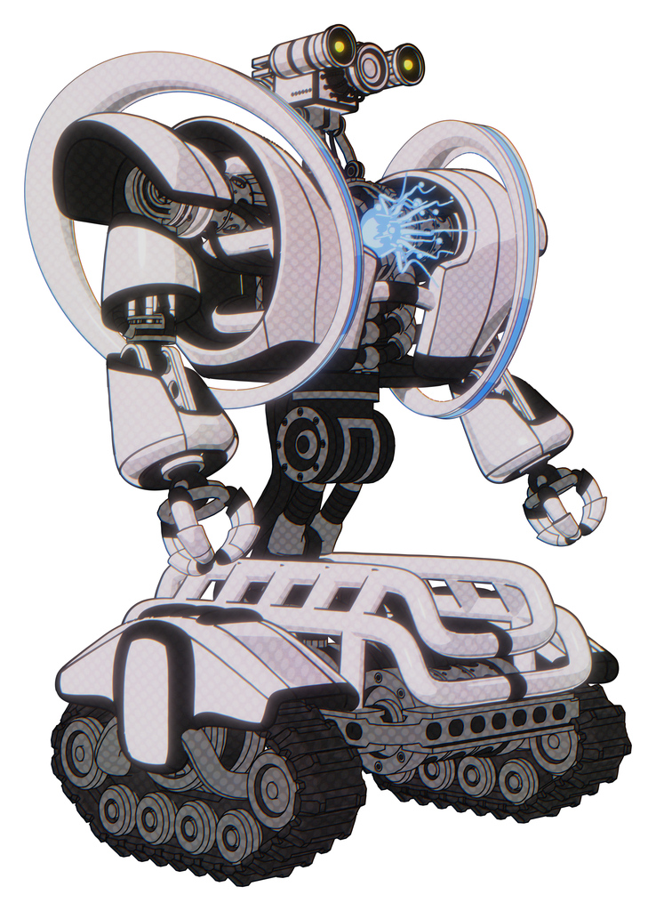 Mech containing elements: dual retro camera head, simple blue telescopic eye head, heavy upper chest, heavy mech chest, spectrum fusion core chest, tank tracks. Material: White halftone toon.