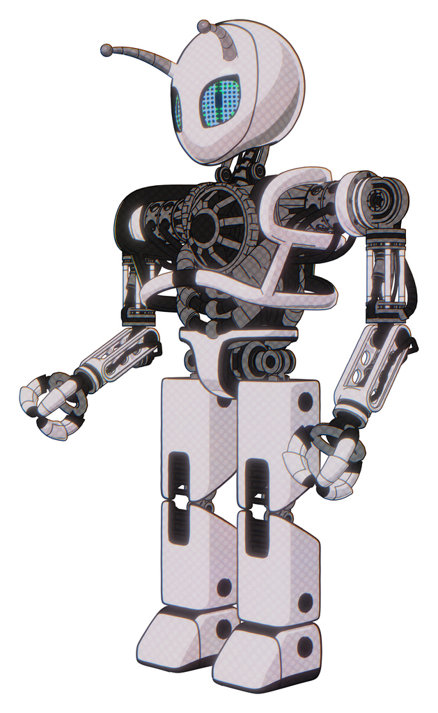Robot containing grey alien style head and blue grate eyes and bug antennas and heavy upper chest and no chest plating and prototype exoplate legs. White halftone toon. Facing right view.