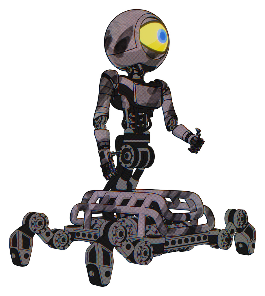 Bot containing giant eyeball head design and light chest exoshielding and ultralight chest exosuit and insect walker legs. Sketch pad wet ink smudge. Facing left view.