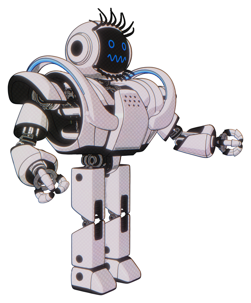 Droid containing digital display head and stunned expression and eye lashes deco and heavy upper chest and heavy mech chest and battle mech chest and prototype exoplate legs. White halftone toon.