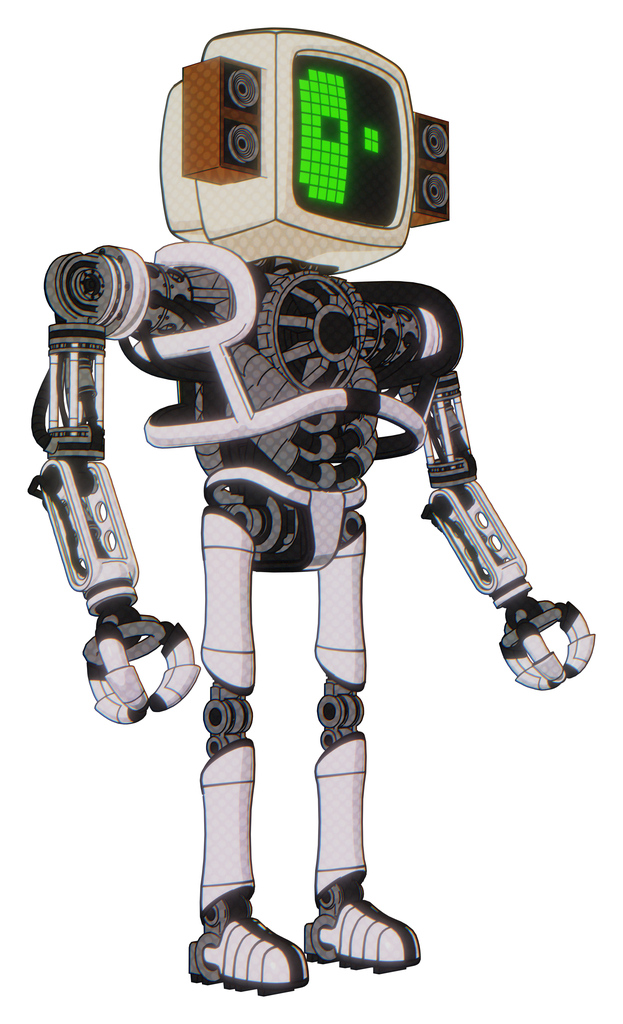 Automaton containing old computer monitor and abstract mask pixel face and old retro speakers and heavy upper chest and no chest plating and ultralight foot exosuit. White halftone toon.