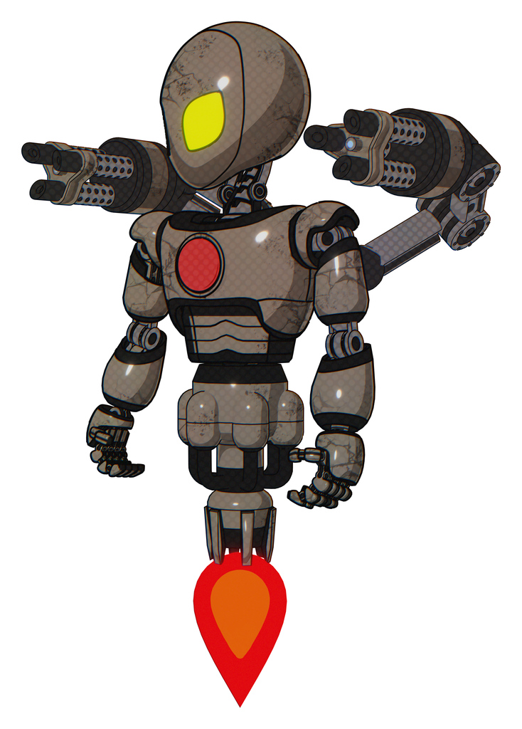 Mech containing grey alien style head and yellow eyes and light chest exoshielding and red chest button and minigun back assembly and jet propulsion. Patent khaki metal.