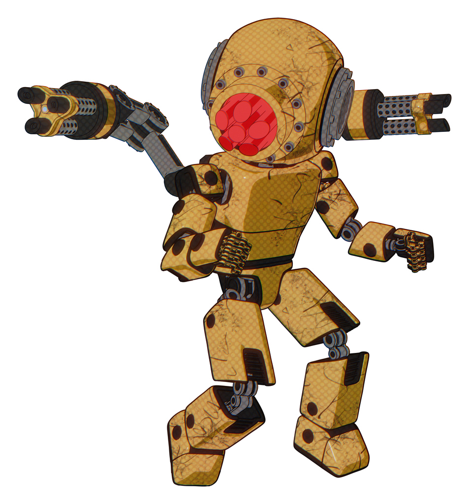 Mech containing round head and red laser crystal array and light chest exoshielding and prototype exoplate chest and minigun back assembly and prototype exoplate legs. Construction yellow halftone.