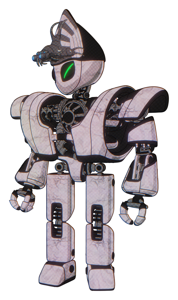 Cyborg containing grey alien style head and green demon eyes and alien bug creature hat and heavy upper chest and heavy mech chest and prototype exoplate legs. Sketch pad light.