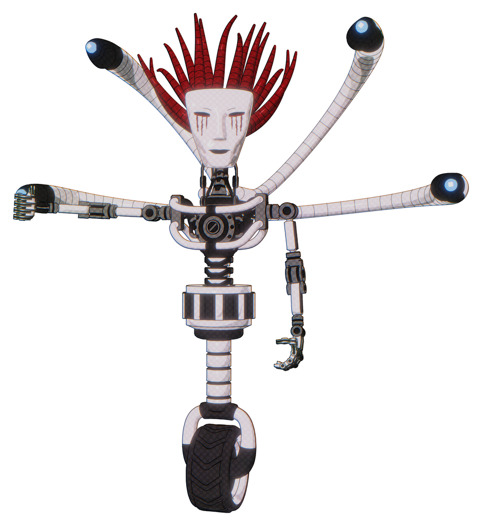 Droid containing elements: humanoid face mask, blood tears, light chest exoshielding, blue-eye cam cable tentacles, no chest plating, unicycle wheel. Material: White halftone toon.