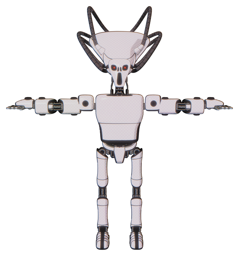 Droid containing flat elongated skull head and cables and light chest exoshielding and prototype exoplate chest and ultralight foot exosuit. White halftone toon. T-pose.