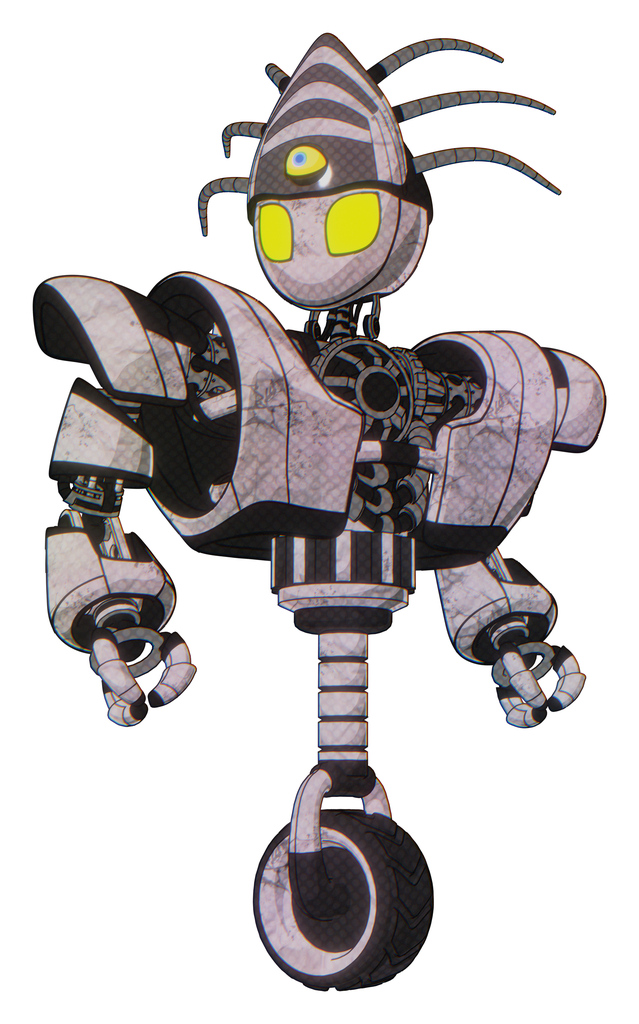 Automaton containing grey alien style head and yellow eyes and eyeball creature crown and heavy upper chest and heavy mech chest and unicycle wheel. Sketch pad. Hero pose.