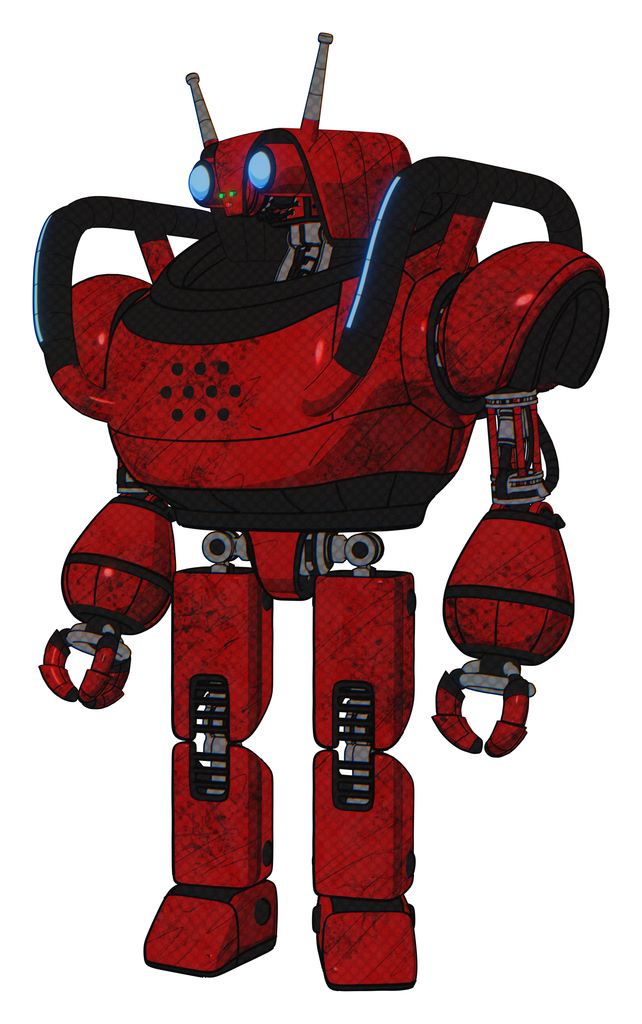 Automaton containing dual retro camera head and cyborg antenna head and heavy upper chest and blue strip lights and prototype exoplate legs. Red blood grunge material.