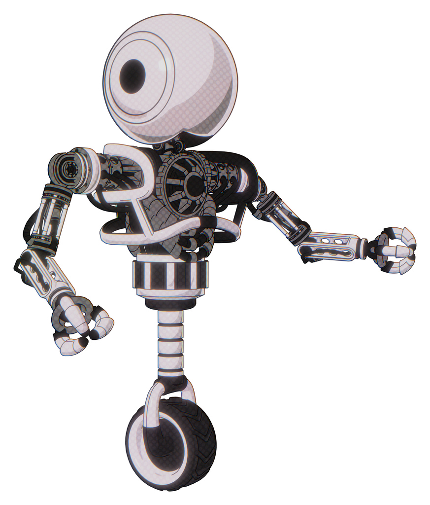 Automaton containing round head and heavy upper chest and no chest plating and unicycle wheel. White halftone toon. Interacting.