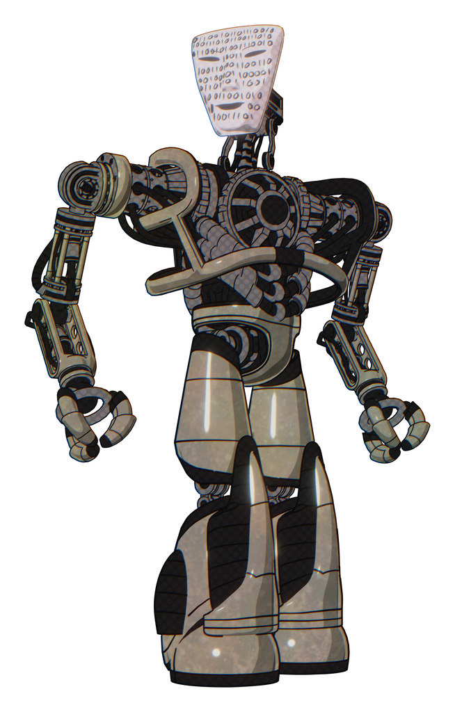 Droid containing humanoid face mask and binary war paint and heavy upper chest and no chest plating and light leg exoshielding and stomper foot mod. Grungy fiberglass. Hero pose.