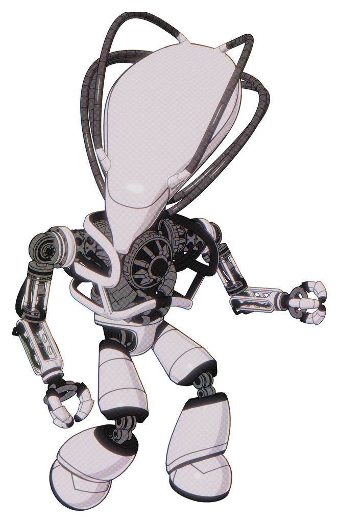 Robot containing flat elongated skull head and cables and heavy upper chest and no chest plating and light leg exoshielding. White halftone toon. Fight or defense pose..