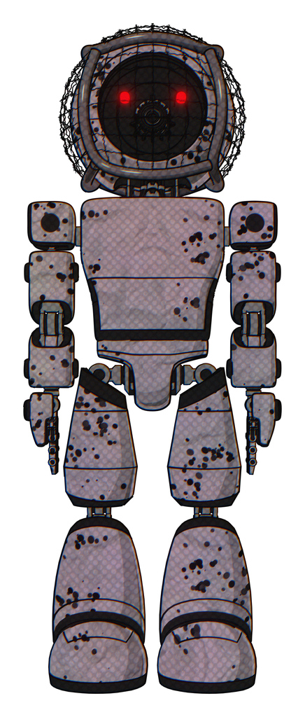 Bot containing round barbed wire round head and light chest exoshielding and prototype exoplate chest and light leg exoshielding. Dark ink dots sketch. Front view.