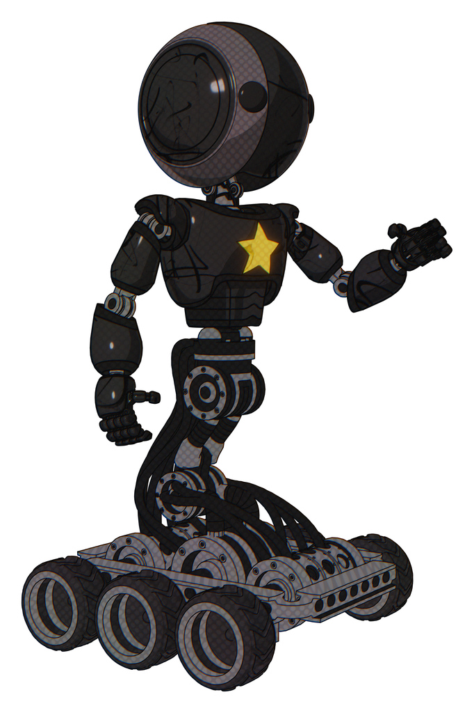 Robot containing round head and maru eyes and light chest exoshielding and yellow star and six-wheeler base. Toon black scribbles sketch. Interacting.