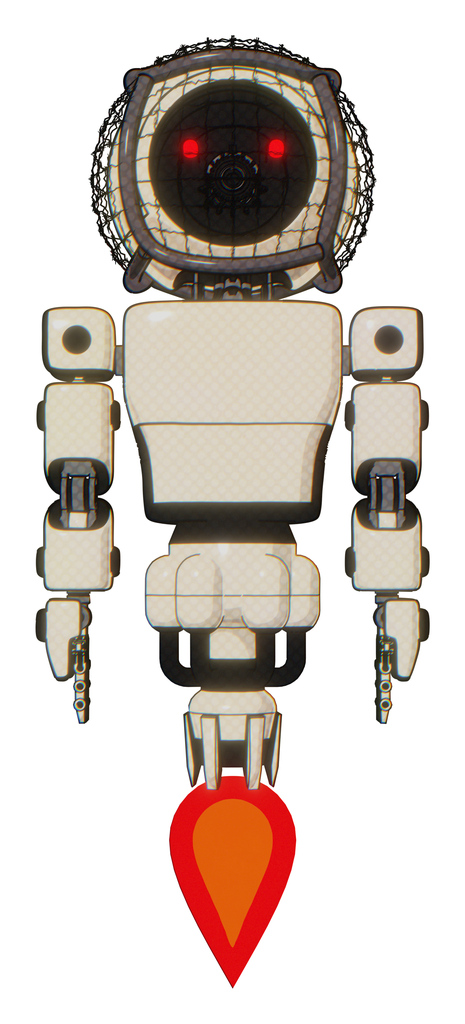 Cyborg containing round barbed wire round head and light chest exoshielding and prototype exoplate chest and jet propulsion. Off white toon. Front view.