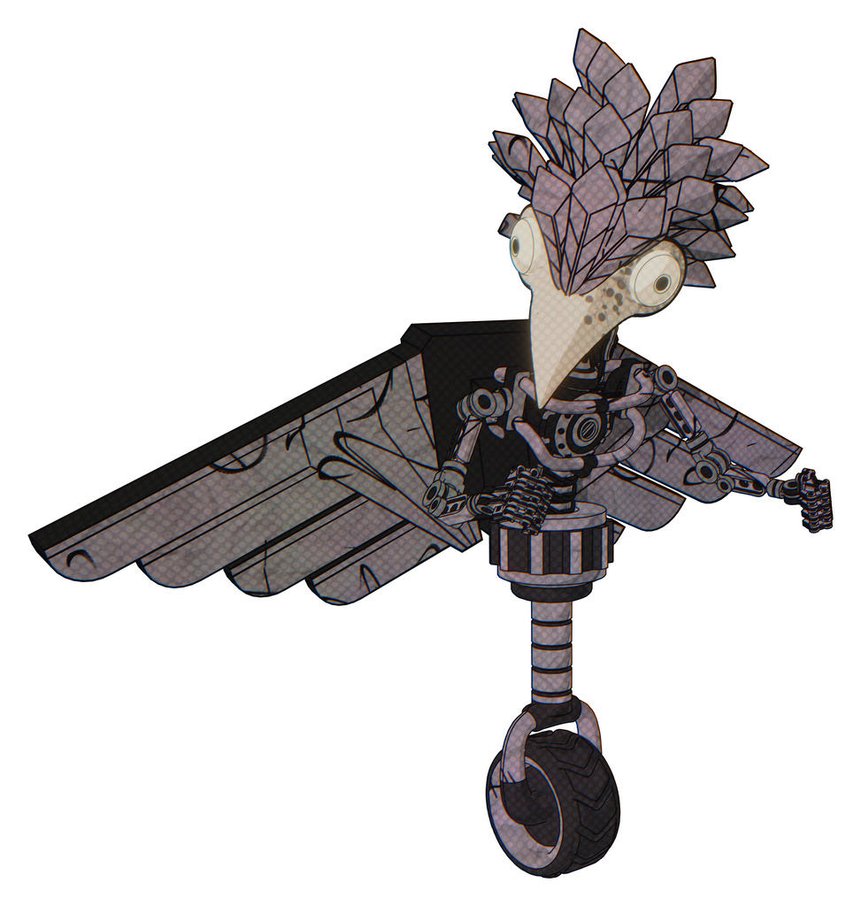 Robot containing elements: bird skull head, bone skull eye holes, bird feather design, light chest exoshielding, pilot's wings assembly, no chest plating, unicycle wheel. Material: Dark sketch doodle.