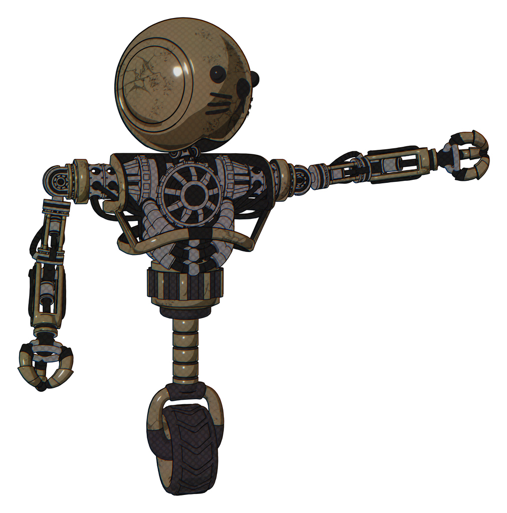 Robot containing round head and heavy upper chest and no chest plating and unicycle wheel and cat face. Desert tan painted. Pointing left or pushing a button..