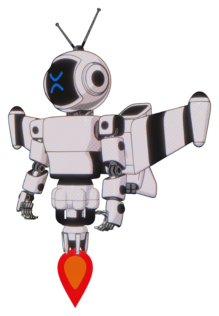Droid containing digital display head and wince symbol expression and retro antennas and light chest exoshielding and prototype exoplate chest and stellar jet wing rocket pack and jet propulsion.