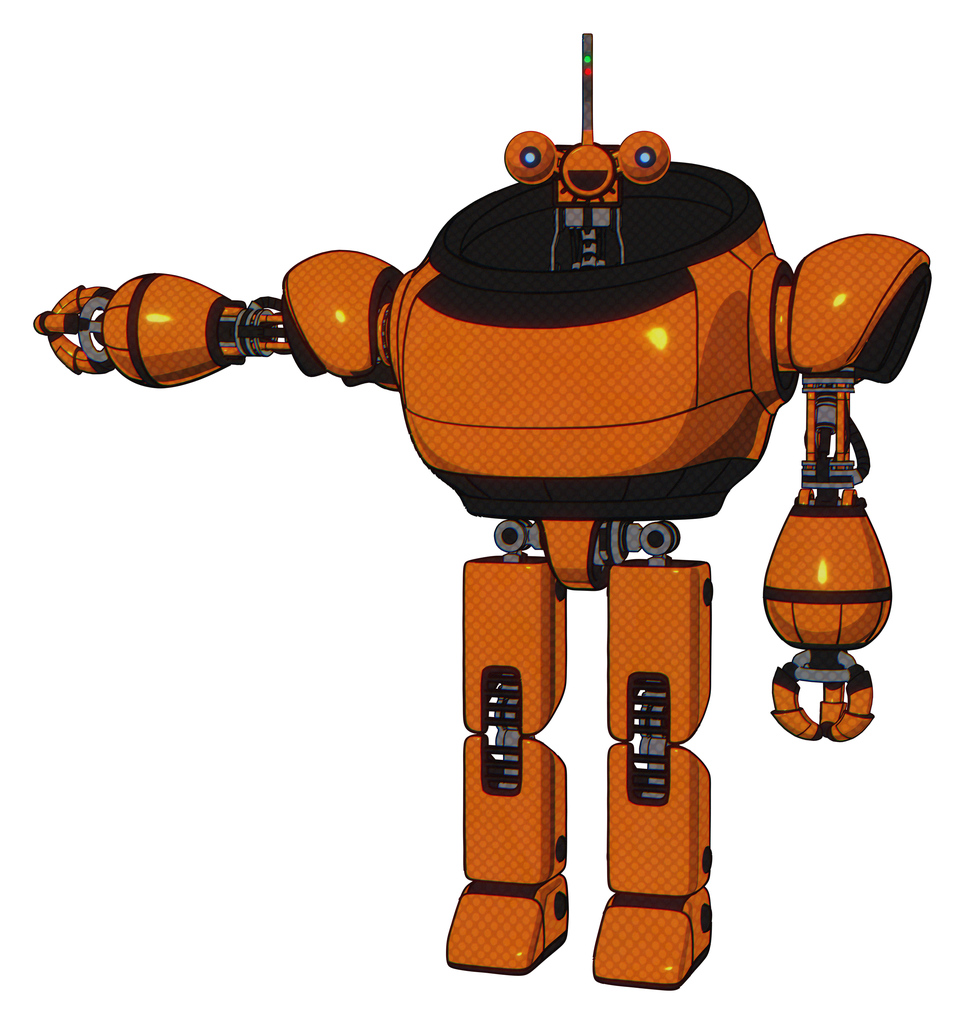Automaton containing dual retro camera head and reversed fin head and heavy upper chest and prototype exoplate legs. Secondary orange halftone. Arm out holding invisible object..