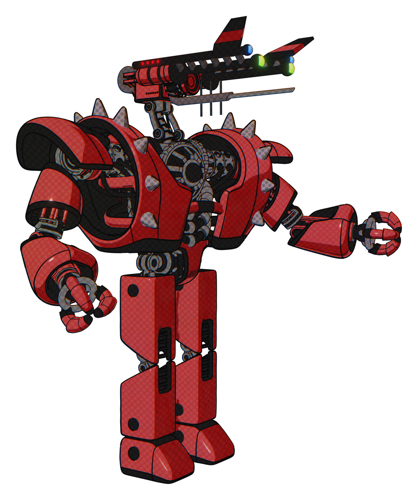 Automaton containing dual retro camera head and communications array head and heavy upper chest and heavy mech chest and shoulder spikes and prototype exoplate legs. Primary red halftone. Interacting.