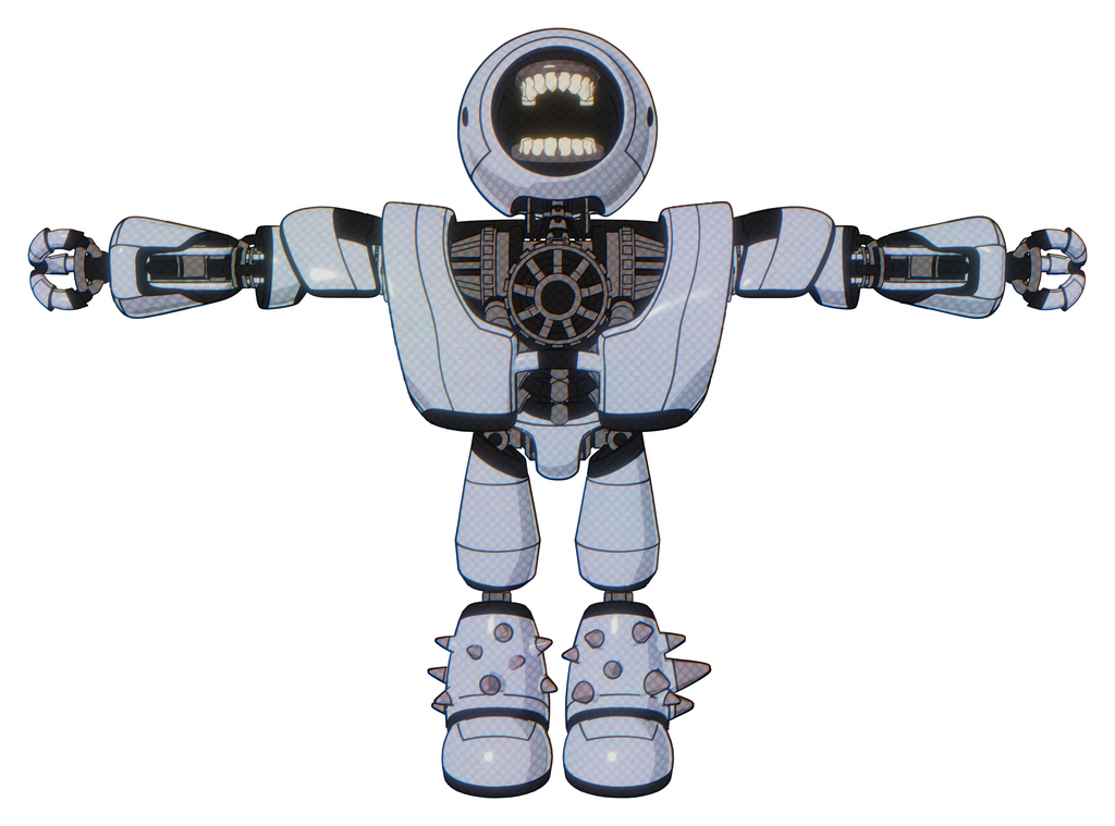 Bot containing round head chomper design and heavy upper chest and heavy mech chest and light leg exoshielding and spike foot mod. Blue tint toon. T-pose.
