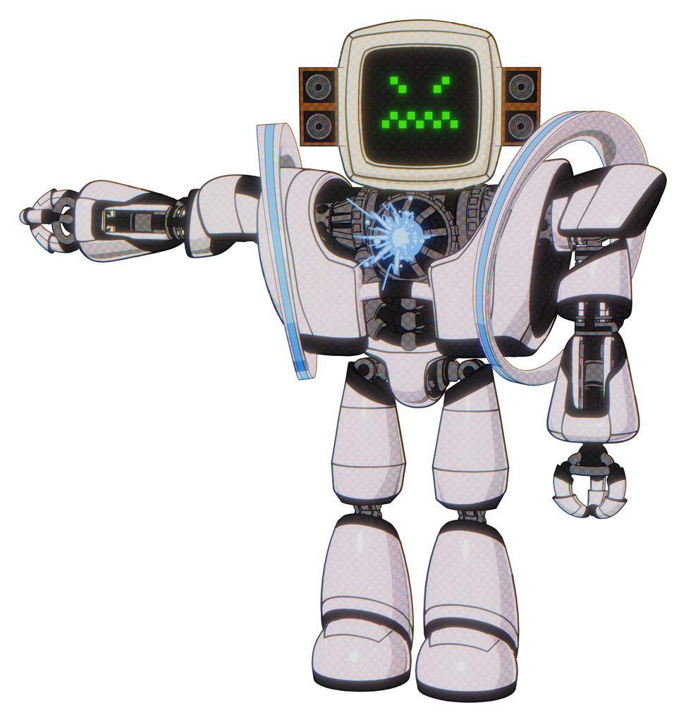 Bot containing old computer monitor and angry pixels face and old retro speakers and heavy upper chest and heavy mech chest and spectrum fusion core chest and light leg exoshielding.