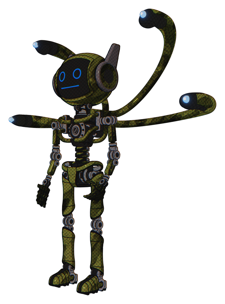 Automaton containing digital display head and blank-faced expression and winglets and light chest exoshielding and blue-eye cam cable tentacles and no chest plating and ultralight foot exosuit.