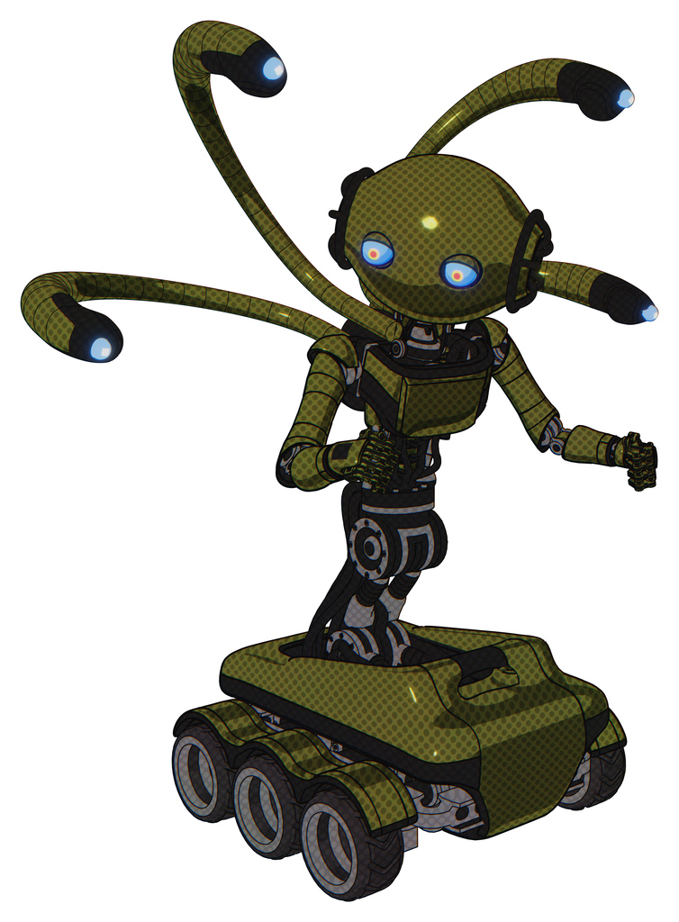 Automaton containing elements: oval wide head, blue eyes, light chest exoshielding, ultralight chest exosuit, blue-eye cam cable tentacles, six-wheeler base. Material: Army green halftone.
