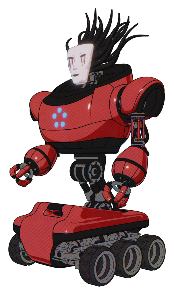 Droid containing humanoid face mask and blood tears and heavy upper chest and circle of blue leds and six-wheeler base. Primary red halftone. Facing right view.