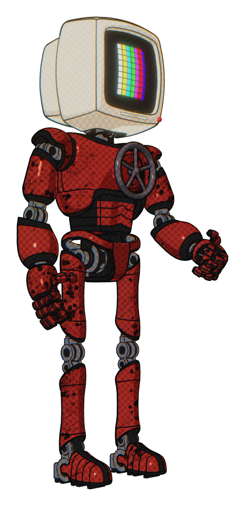 Automaton containing old computer monitor and please stand by pixel design and light chest exoshielding and chest valve crank and ultralight foot exosuit. Grunge dots cherry tomato red.