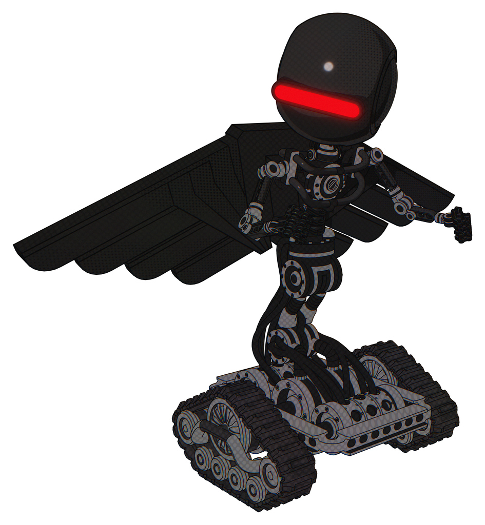 Droid containing round head and horizontal red visor and light chest exoshielding and pilot's wings assembly and no chest plating and tank tracks. Clean black. Fight or defense pose..