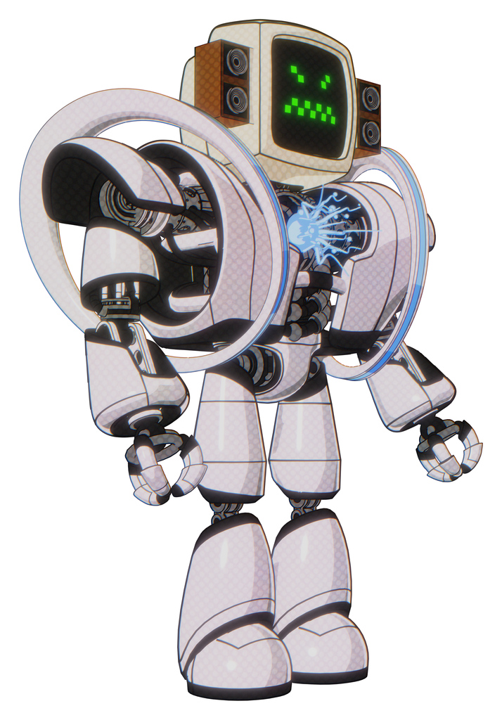 Bot containing old computer monitor and angry pixels face and old retro speakers and heavy upper chest and heavy mech chest and spectrum fusion core chest and light leg exoshielding.