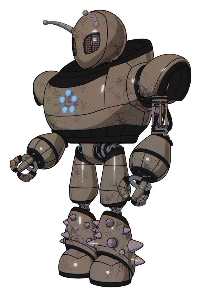 Mech containing grey alien style head and metal grate eyes and bug antennas and heavy upper chest and circle of blue leds and light leg exoshielding and spike foot mod. Patent khaki metal.