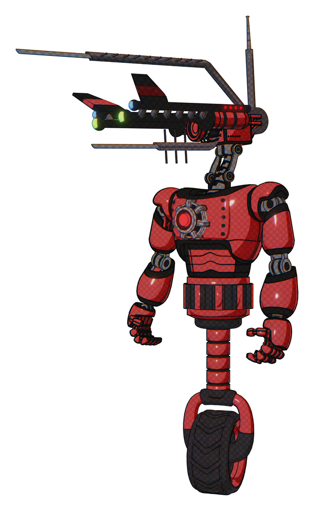 Cyborg containing dual retro camera head and communications array head and light chest exoshielding and red energy core and unicycle wheel. Primary red halftone. Standing looking right restful pose.